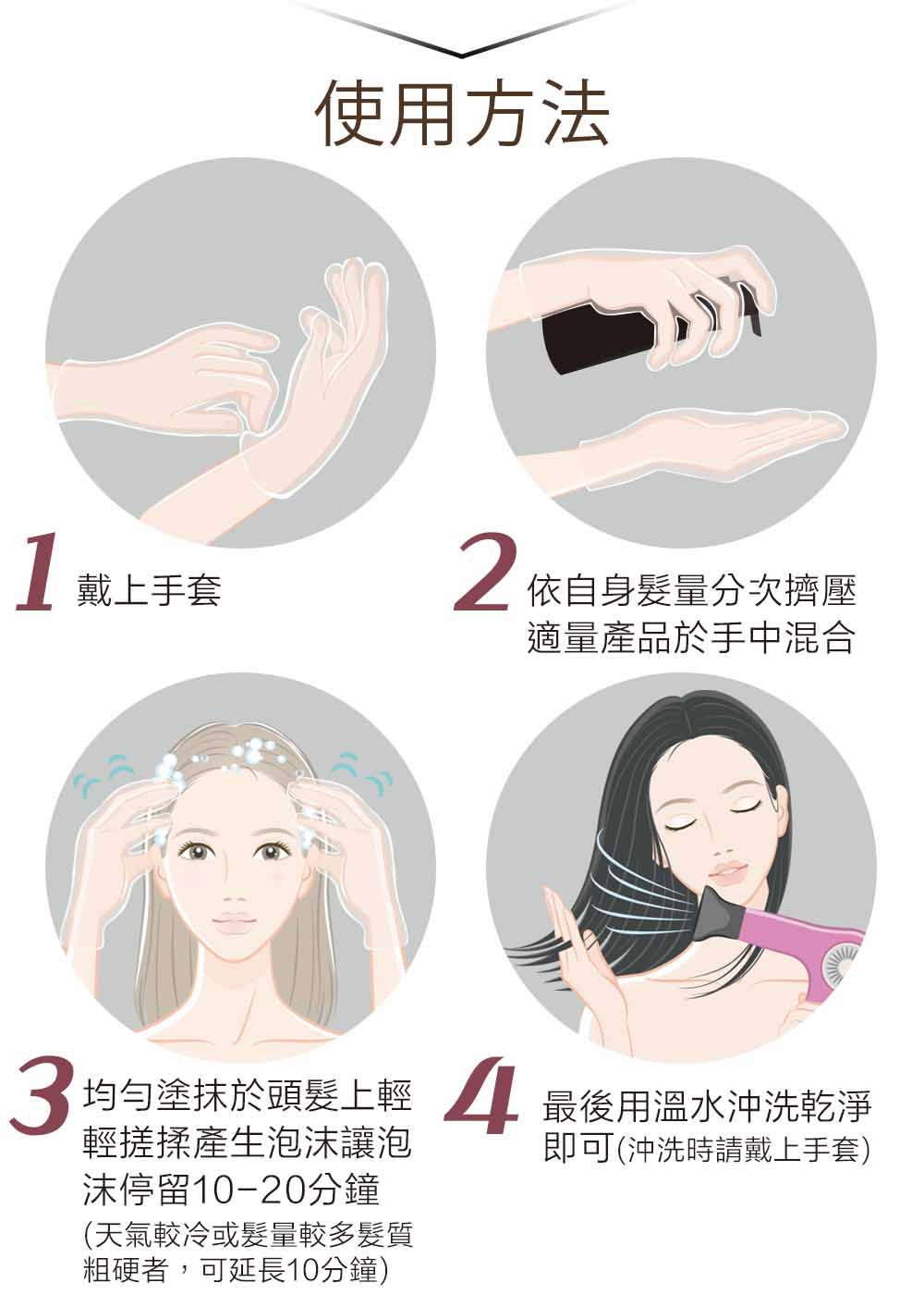 待停留時間完成後,請以溫水完全沖淨後接著正常洗髮程序洗淨即可