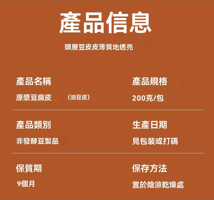 5分鐘前【正宗頭層手工蟬翼豆腐皮】採用高山有機大豆,手工製作的頭層豆皮,薄如蟬翼,做春卷,響鈴,涼拌菜等,多種吃法,煮湯,炒菜都可以。 - 【頭層豆腐皮 薄如蟬翼】3入組(約150張)NT$1298