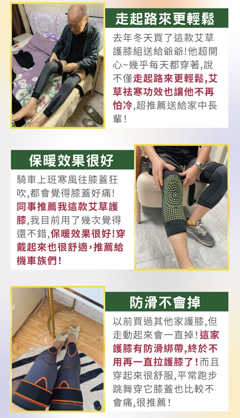 11分鐘前爆款艾草護膝 真正加倍保暖護膝,四季通用,老寒腿、關節涼、膝部不適專用! - 買1送1雙 NT$998 日本第一套會發熱的護膝(降低99%關節疼痛感)