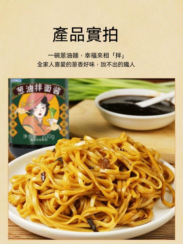25分鐘前醇厚麵醬,完美搭配麵食,展現獨特風味 ,五分鐘就能吃上的蔥油拌面 ,無需繁瑣步驟 ,開瓶即食 油潤蔥香即刻享用 ,增鮮提香 ,秒變大廚 ,飯或者面都能一勺搞定 - 【家庭囤貨裝】6入組-NT$1380