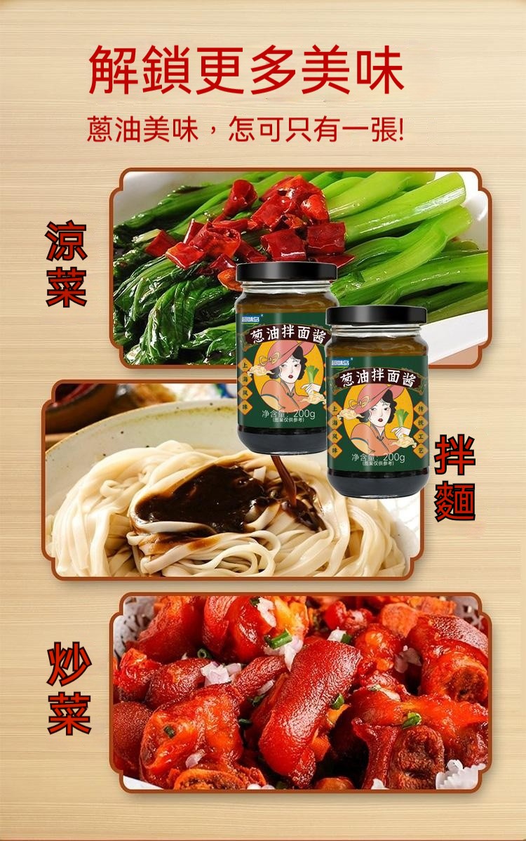 半小時前醇厚麵醬,完美搭配麵食,展現獨特風味 ,五分鐘就能吃上的蔥油拌面 ,無需繁瑣步驟 ,開瓶即食 油潤蔥香即刻享用 ,增鮮提香 ,秒變大廚 ,飯或者面都能一勺搞定 - 【98%客戶選擇】4入組-NT$1180