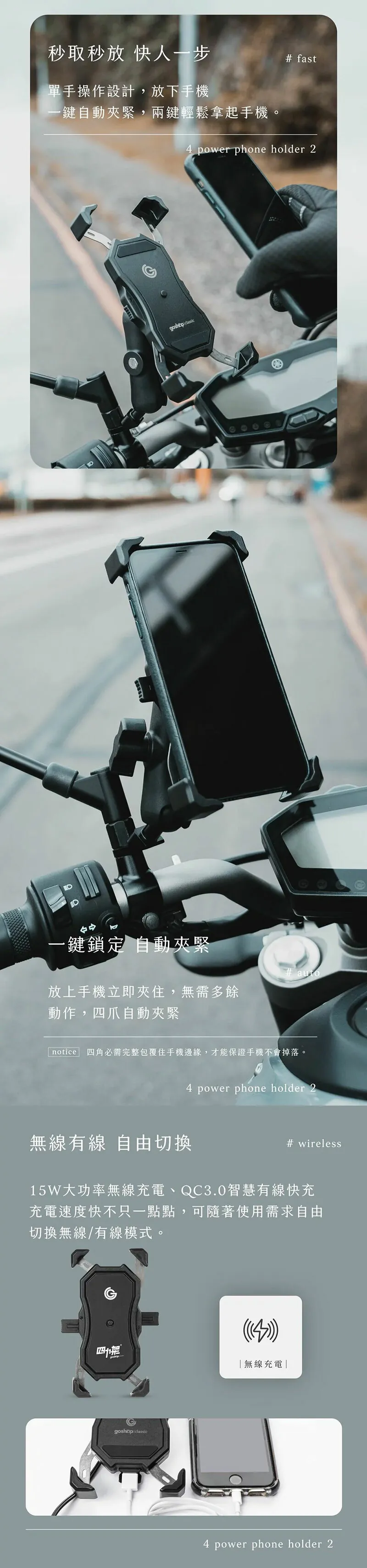 半小時前GC 四力架2 / 2s 單手操作 快人一步 最新四力架2 Pro 自動夾緊 USB充電 無線充電兩用機車手機架 外送必備 接單神器 - 四力架2s Pro(快充版)一入組NT$1,180