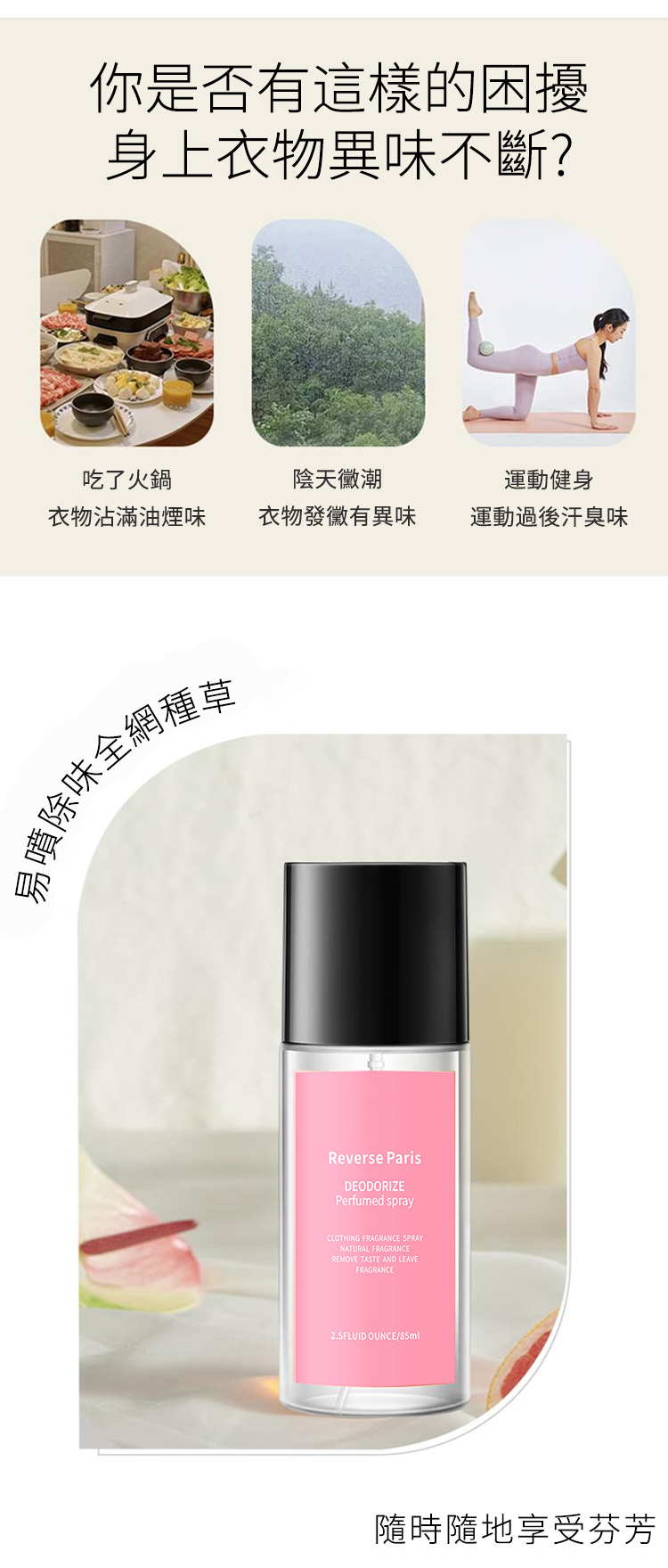 半小時前【衣物香氛喷雾】不用洗衣服,也能去除衣服異味。一噴就香,留香持久,讓衣服擁有自然體香。 - 【買2送2 】4入組 NT$998