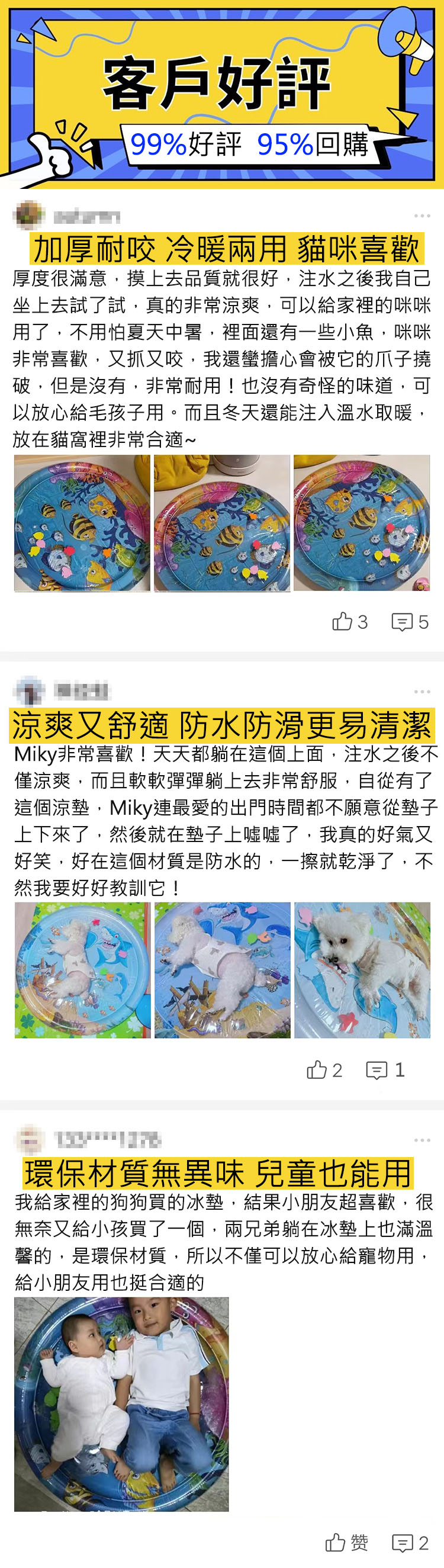 25分鐘前【冷暖兩用!夏季直降7℃,冬季可加溫水40℃!環保防滑材質,無異味更安心,充氣注水軟彈舒適,貓狗四季通用!兒童可用】寵物大水床 超大直徑 玩趣圖案 寵物孩子都可躺可玩耍 - 【65cm,2組入】划算,每個均價不到550!僅需1099