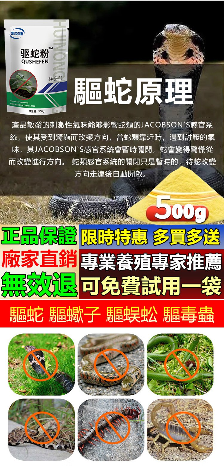 半小時前【强效驅蛇粉】千米内無蛇,不毒家禽, 保護家禽,驅蛇/驅蠍子/驅蜈蚣/驅毒蟲,一撒驅蛇蟲,時效可達90天,不怕雨淋 - 【破盤嗨購】買二送三 5入組 NT$-1498