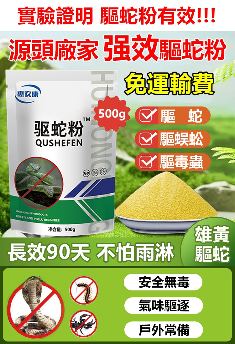 4分鐘前【强效驅蛇粉】千米内無蛇,不毒家禽, 保護家禽,驅蛇/驅蠍子/驅蜈蚣/驅毒蟲,一撒驅蛇蟲,時效可達90天,不怕雨淋 - 【破盤嗨購】買二送三 5入組 NT$-1498