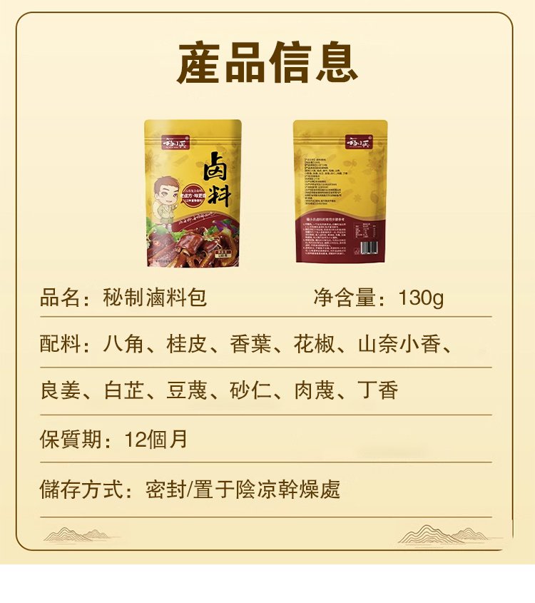 5分鐘前【限時搶購】秘製鹵料包 有了這個秘製滷料包,想吃什麼就滷什麼!百年老店獨家秘製配方,自己在家做,乾淨又衛生,味道比外面賣的還好吃~十八味秘制鹵肉料包 - 3包(30袋)NT$998