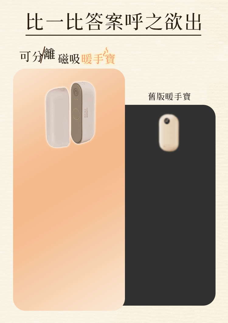 25分鐘前【口碑爆棚!冬天禦寒神器!!】磁吸暖手寶! 外套再厚手還是很冷!暖手過冬就靠它!!! 3秒瞬熱,迅速溫暖你的雙手!! 3檔調溫設計,隨心調你想要的溫度!! 磁吸組合設計,左右手分開使用不怕冷!! - 買二送二暖手寶 『4入組』僅需-NT$1488 均價NT$372